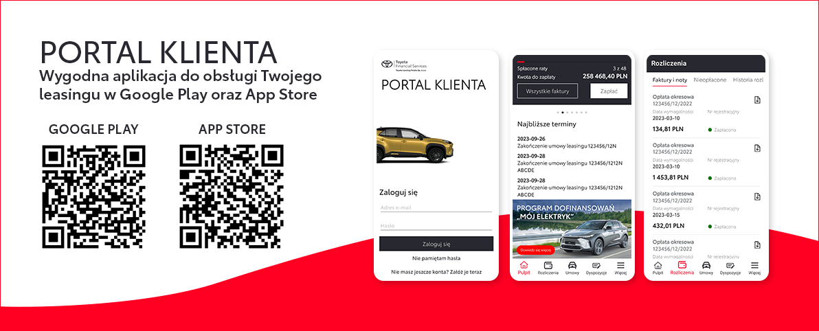 Aplikacja mobilna Portalu Klienta Toyota Leasing Polska oferuje taki sam zakres funkcji, który jest dostępny w pełnej wersji na komputerach, dając klientom pełną kontrolę nad swoimi umowami i finansami.